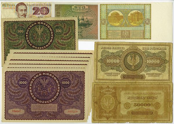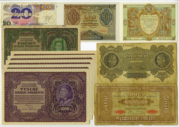 Poland, lot includes from the 1922 issue 10000 Marek Polskich, Fine; 50000 Marek Polskich, VG; 50 Zlotych, 1929, About Uncirculated; 100 Zlotych, 1941, about Uncirculated; 500 Marek Polskich, 1919, About Fine; and 1000 Marek Polskich, 1919, P-29, 6 pcs all AU-UNC; also a 20 Zlotych, 1982, Fine.