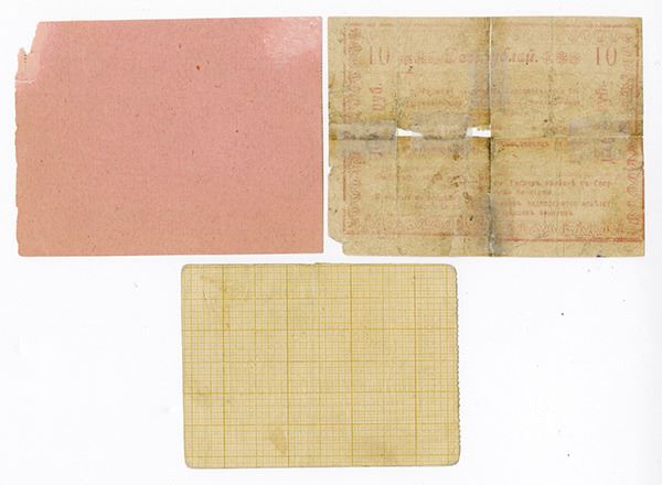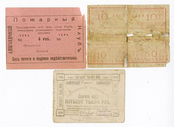 Russia. Lot includes Aleksandrovskiy Fire Club, unissued 4 Rubles, VF w/rough top right corner & margin; Gagarin Cooperative "Shop Stamp" exchange token for 500 Thousand Rubles, 1922, Fine; and Town of Gagry Duma (Georgia), 10 Rubles, 1918, Fair with repairs. 3 pieces in total, sold as is.