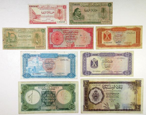Libya. Includes Bank of Libya 1/4 Pound, P-23, Fine; 5 Pounds, P-26, F-VF; and 10 Pounds, P-27, Ch.F-VF. Also included United Kingdom of Libya 5 Piastres, P-5, VF and 10 Piastres, P-6, Fine; Kingdom of Libya 10 Piastres, 1952, P-13, Fine; and Central Bank of Libya 1/4, 1/2, and 1 Dinar 1972, P-33b, 34b, 35b, Fine with faults.