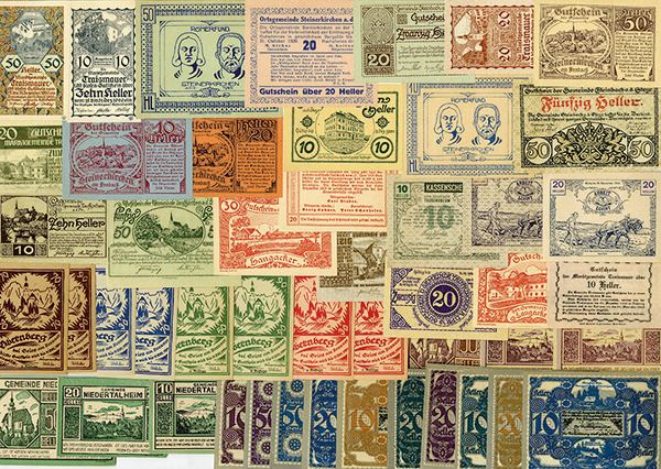 Includes numerous different colorful small size notes with denominations of 10-20-25-50 Heller. Issuing localities include Westfalen, Krimml, Salzburg, Traisen, Werfen, Waidhofen, Kleinmunchen, and others. Please inspect. Generally XF-UNC.