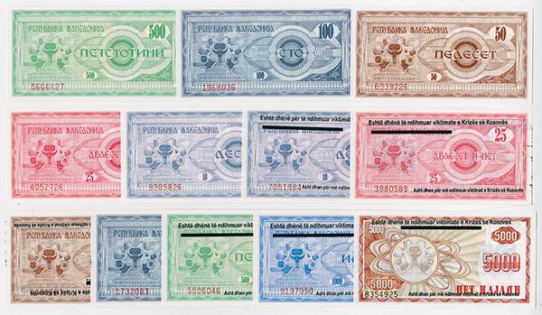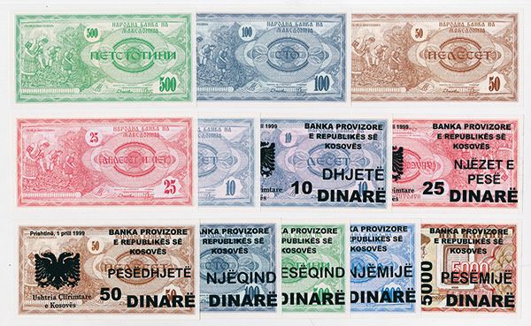 Macedonia. Lot includes 10, 25, 50, 100 and 500 Denar, 1992, P-1 to P-5, of the first issue of the National Bank of Macedonia. Also included is a set of the same banknote plus the 1000 and 5000 Denar, all overprinted in 1999 by the provisional Kosovo government with "Banka Provizore e Republikes se Kosoves", Albanian double headed eagle, and re-denominated 10, 25, 50, 100, 500,1000, and 5000 Dinare, unusual and unlisted. All Choice to Gem Unc. (12)