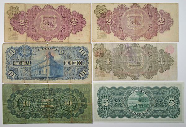 Mexico... Lot of 6 notes, includes notes from Banco Oriental de Mexico a trio of 1 Peso and 2 Pesos notes; Banco de Tamaulipas remainder 5 Pesos note; Banco Nacional de Mexico 10 Pesos; and Banco de Sonora 10 Pesos. P-S258d; S388a; S389b (2); S420; S429r. Fine to XF. (6)