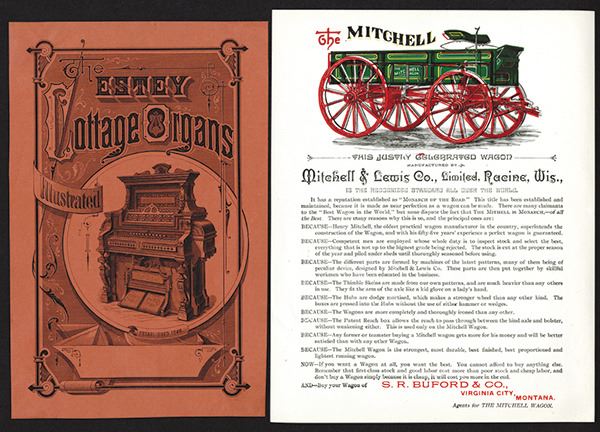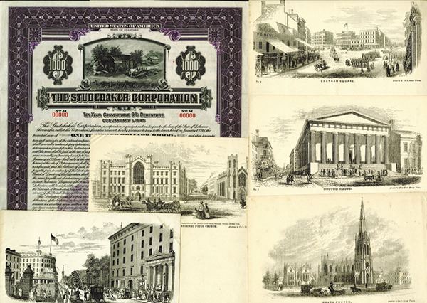 United States. Five NYC views 1850, on letterhead sheets featuring views of Chatham square, Custom House, Grace Church, NYU, Broadway from City hall Park. , Estey Cottage Organs, Mitchell & Lewis Co. Racine WI. Wagons, and Studebaker Corporation Coupon Bond Specimen of 1935.