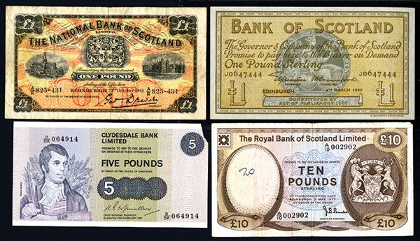 Scotland, group of 4 issued notes, includes National Bank of Scotland, 1 Pound, P-285a, VF; Bank of Scotland, 1 Pound, P-96b, XF PMG 40 EPQ; Clydesdale Bank Limited, 5 Pounds, P-205 unlisted with 1981 date, AU but missing top right corner; and Royal Bank of Scotland, 10 Pounds, P338a, VF.