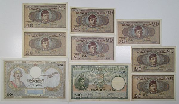 Yugoslavia.... Lot includes a large mixed group of various Yugoslavian issues including denominations of _, 1, 5, 10, 20, 50, 100, 500, 100, 50000, 10000, 50 Million, 100 Million, 500 Million, and 5 Billion Dinara, with good representation of earlier Kingdom-era and wartime issues as well as later National Bank of Yugoslavia issues. Generally Fine to VF, some better. Please inspect. (54)