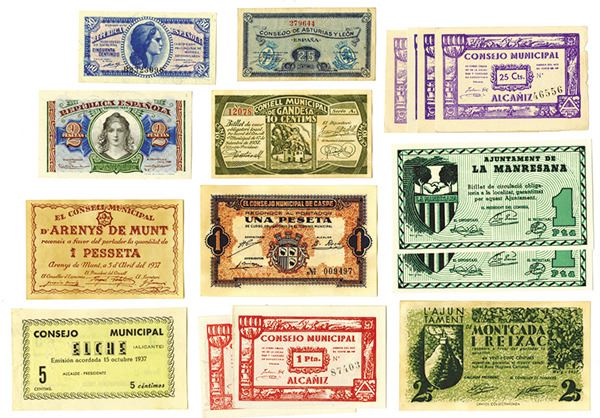 Spain, group of small size local and municipal scrip notes for various small denominations of 25 Centimos, 50 Centimos, 1 Peseta, and 2 Pesetas. Generally Extra Fine to Uncirculated condition. Please inspect.