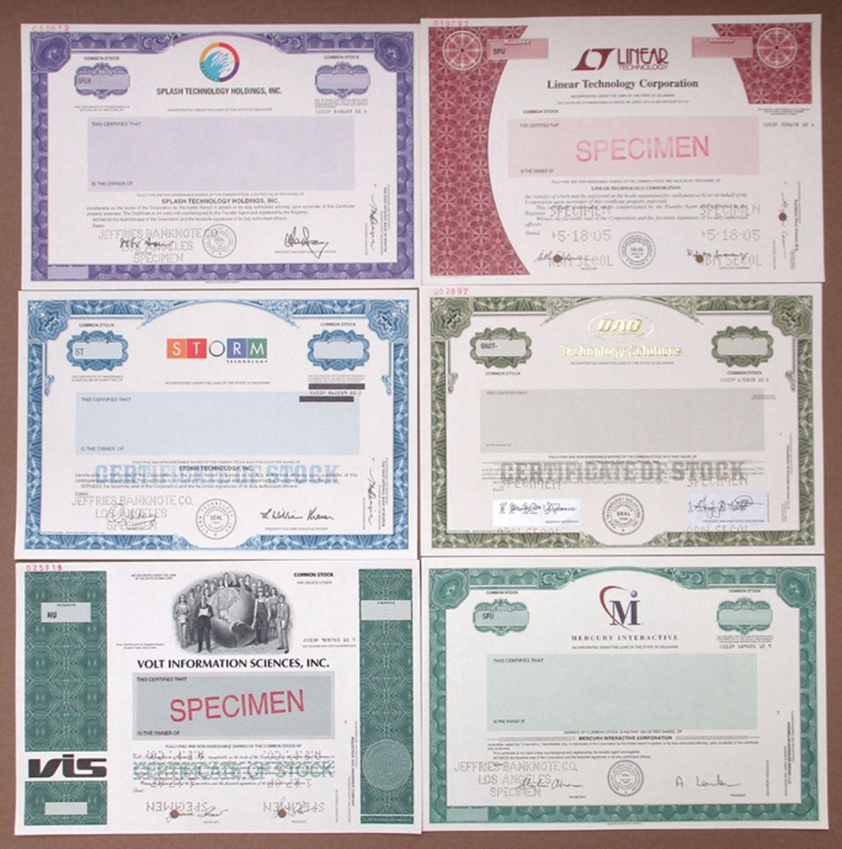 Various States, 1989-2007. Lot of 6 Specimen Stock Certificates, Includes: Mercury Interactive Corp., Technology Solutions, Inc., Linear Technology Corp., Splash Technology Holdings, Inc., Volt Information Sciences, Inc., and Storm Technology, Inc. All are marked as Specimen with either overprints or pin punches and certificates are in Uncirculated condition. (6). Sold "AS IS" no returns accepted.