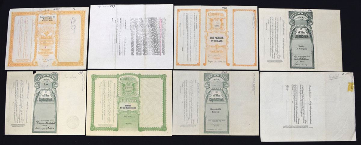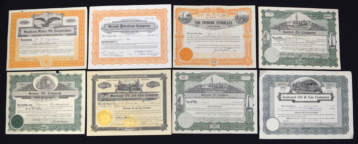 Various States, ca. 1900-50s. Lot of 8 I/U Stock Certificates from various regional oil companies, including Southern States Oil Corp., Sevrull Petroleum Co., The Pioneer Syndicate, Sattley Oil Co., Service Oil Co., Santiago Oil & Gas Co., Placerita Oil Co., and Seaboard Oil & Gas Co. Strong variety of border colors and vignettes featuring oil derricks, refineries, and allegorical scenes. VF to XF overall. (8). Sold "AS IS" no returns accepted.