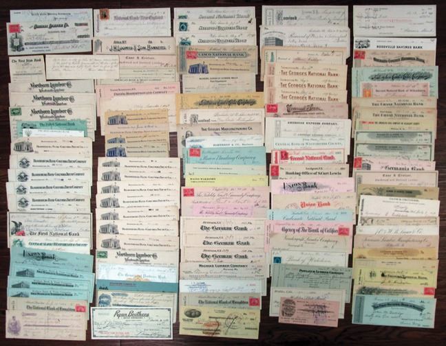 Various States�.. ca.1860 to 1930s, Lot of 100+, I/C; I/U; and U/U Check Assortment, Most are related to Lumber nad business companies, Ranges from VF-XF condition. (100+). Sold "AS IS" no returns accepted.