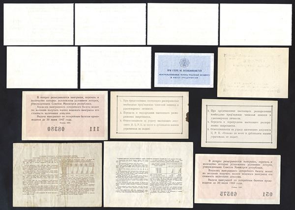 Russia, Lot of uncommon and specialized Soviet era notes, includes from the 1961 Gosbank issue, 1-2-5-10-50 Kopeks and 1 Ruble, P-SFX80 to P-SFX85, all UNC, and used on ships to buy food; from the Ministry of Coal Industry, a 2 Kopek coupon for internal payments, UNC; two store receipts for 1 Ruble from Krasnodar, and 5 Rubles from Novorossiysk, both XF+; also four lottery tickets issued by the Ministry of Finance, 25 Rubles, 1948; 10 Rubles, 1943; 3 Rubles, 1959; and 30 Kopeks, 1966; and finally an unusual "business card" for famous doctor and numismatist-collector Eduard Dmitrievich Gribanov, made to look like local Russian scrip. (14)