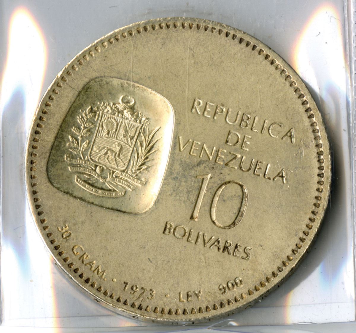 Venezuela, 1973. 10 Bolívares silver commemorative coin with portrait of Simón Bolívar on face, Struck in .900 fine silver, weighing 30 grams with an actual silver weight (ASW) of 27 grams (0.868 troy oz) and an approximate 39 mm diameter.