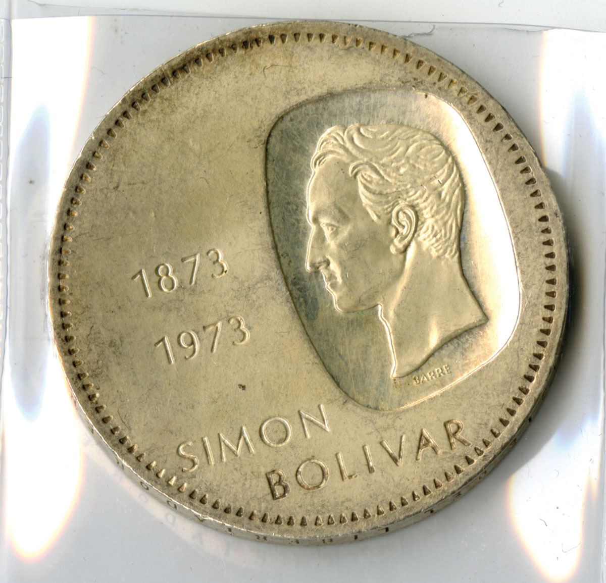 Venezuela, 1973. 10 Bolívares silver commemorative coin with portrait of Simón Bolívar on face, Struck in .900 fine silver, weighing 30 grams with an actual silver weight (ASW) of 27 grams (0.868 troy oz) and an approximate 39 mm diameter.