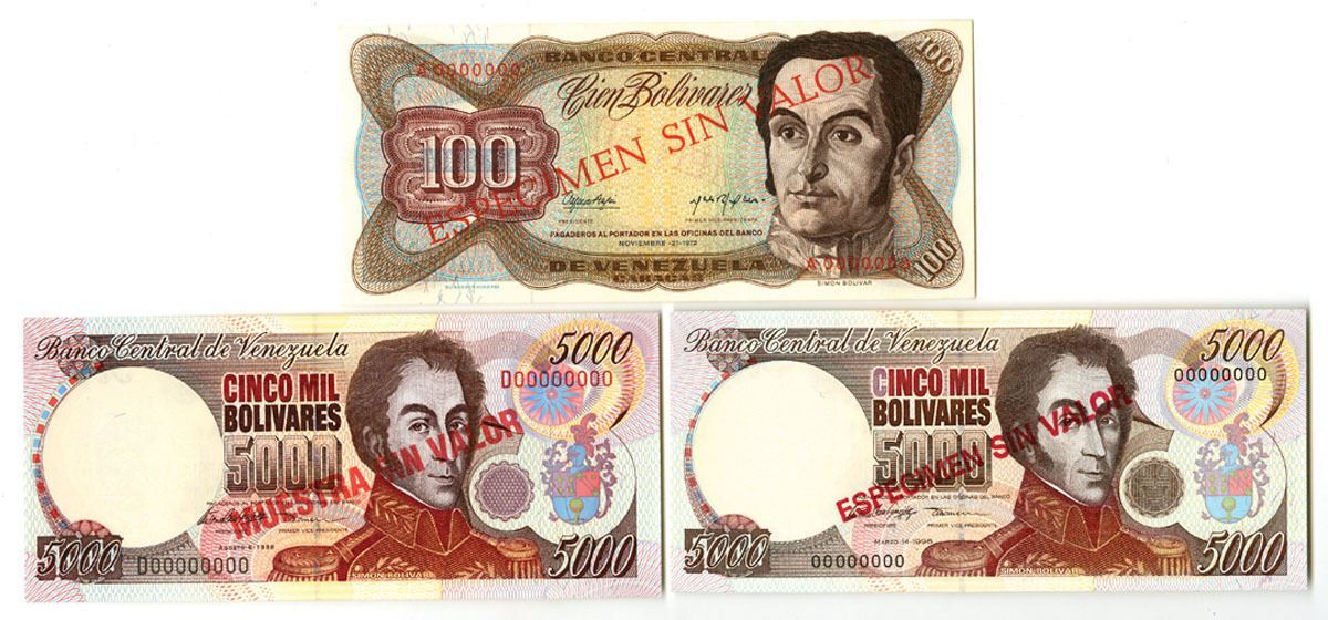 Venezuela, 1972 to 1998. Lot of 3 Specimen Banknotes, Includes: 1972, 100 Bolivares, P-55s1, BDDK; 1996, 5000 Bolivares, P-75bs; 1998, 5000 Bolivares, P-78cs. All have Specimen overprints and are in AU to UNC condition. (3). Sold "AS IS" no returns accepted.