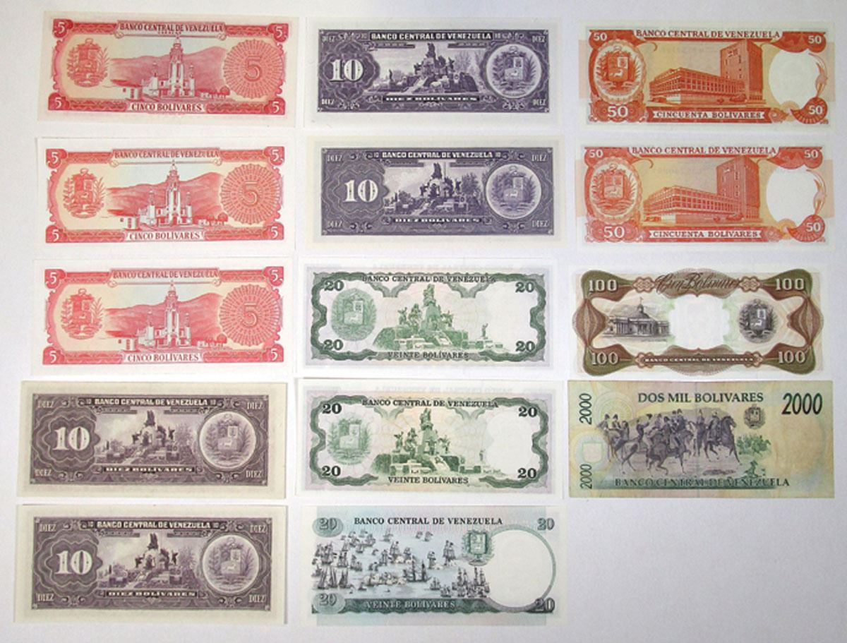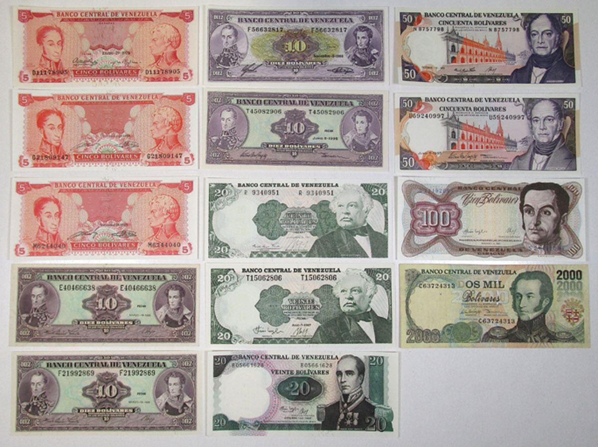 Venezuela, 1974 to 1998. Lot of 14 Issued Banknotes, Includes: 1974, 10 Bolivars, P-51d, ABNC; 1986 and 1995, 10 Bolivars, P-61a (2) and P-61d, ABNC; 1988, 10 Bolivars, P-62, TDLR; 1984, 20 Bolivars, P-64, CdM-B; 1987, 20 Bolivars, P-64A, ABNC; 1985 and 1995, 50 Bolivars, P-65a and P-65e, BDDK; 1987, 100 Bolivars, P-66a, BDDK; 1989, 5 Bolivars, P-70 (2), TDLR; 1987 (1989), 20 Bolivars, P-71; 1998, 2000 Bolivars, P-77b. Notes range from VF to Gem Uncirculated condition. (14). Sold "AS IS" no returns accepted.
