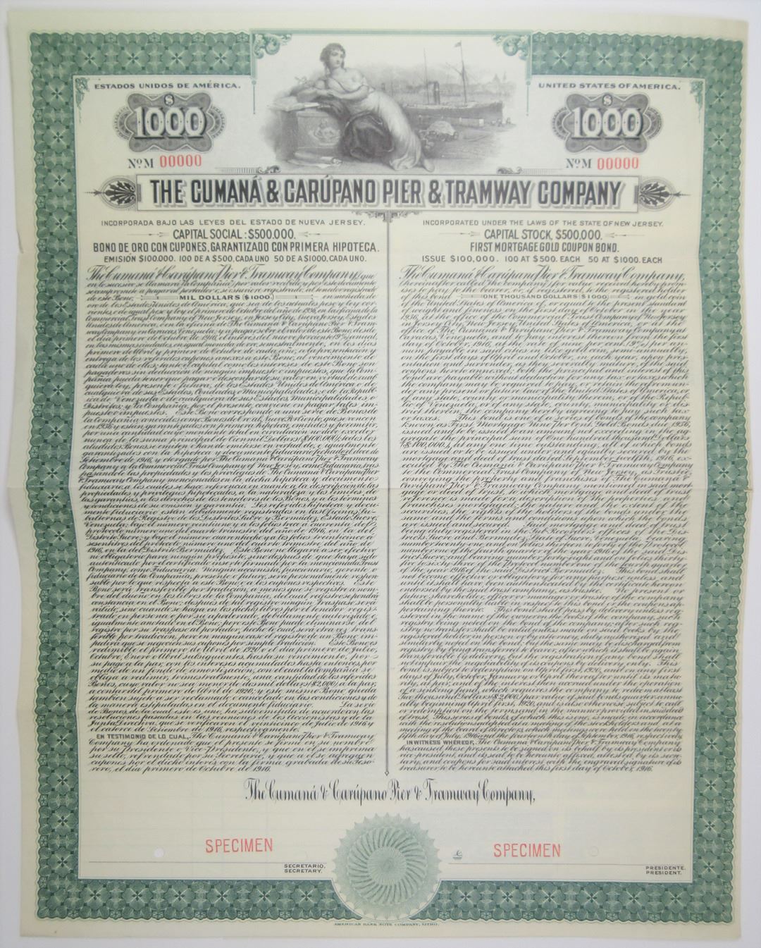 Caracas, Venezuela (Inc. in New Jersey), 1916. $500 Specimen 9% First Mortgage Gold Coupon Bond in Spanish and English, Black text with blue border, Allegorical woman reclining at top center. Red specimen overprints, 00000 serial numbers, and POCs. VF condition, ABNC.