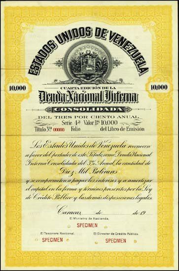 "Deuda Nacional Interna Consolidada". 8 different specimen Bonds. Caracas, Venezuela. 19-- (ca.1900-1920). All are 3% interest bonds. all but one has coupons. All are different color borders. Denominations include 1000; 2000; 2,500; 10,000; 15,000; 20,000; 25,000 Bolivares and Odd Bolivares. All are different series. Arms of Venezuela on top. Rare bond assortment from Venezuela. ABNC.