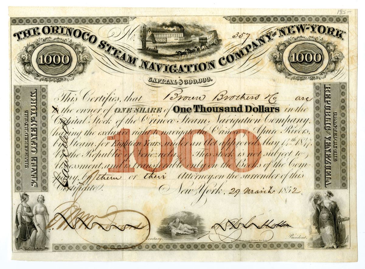 Venezuela (Inc. in New York), 1852. 1 Share Capital Stock I/C Certificate, Black print with black border and Red "1000" underprint, Carriage passing steamship at top center above title with other vignette at bottom, S/N 357, Crossed out cancelled, VF to XF condition. The company had the exclusive right to "Navigate the Orinoco, Apure Rivers by steam for 18 years under an Act approved May 1, 1847 by the Republic of Venezuela". VF condition, RWH&E.