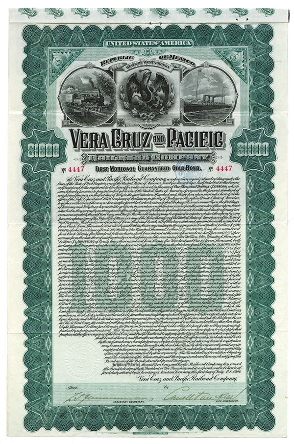 Mexico, $1000, 1st Mortgage Guaranteed Gold Coupon Bond, Black on green border and underprint, Locomotive on left, Mexico arms in middle and steamship at right, VF, Western BNC. S/N 4447. 14 coupons attached. VF condition, Only one previous issued bond is listed for this railroad in Cox.
