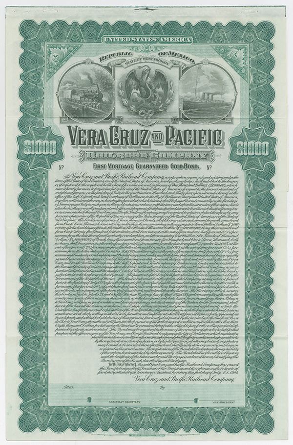 Mexico, $1000, Specimen 1st Mortgage Guaranteed Gold Coupon Bond, Black on green border and underprint, Locomotive on left, Mexico arms in middle and steamship at right, VF, Western BNC. Only one previous issued bond is listed for this railroad in Cox, this is an unlisted specimen and the only one found in the archives.