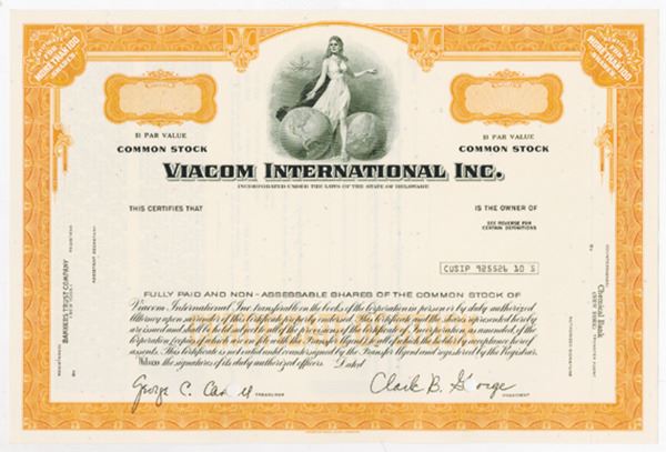 Delaware. >100 Shares Specimen Stock Certificate, Black print on orange border and under tint, Allegorical woman standing at top above company title, POC's at bottom, VF-XF condition, ABNC. Viacom International Inc. is a subsidiary of Viacom. It is the holding company for copyrights and trademarks associated with Viacom's corporate websites and its cable networks, specifically Viacom Media Networks, and is the division which licenses the product rights for their various properties. Before the merger with CBS Corporation in 1999, it also acted as the licensee company for Viacom's owned television stations; for instance New Britain, Connecticut station WVIT, currently an NBC owned and operated station for the Hartford market owned by Viacom from 1978 until 1997, took their call letters from Viacom International. Viacom International also continues to focus on its own in-house productions made for its various networks such as MTV, VH1, and Nickelodeon. Viacom International is a partner in Comedy Partners, the Viacom subsidiary which owns Comedy Central.