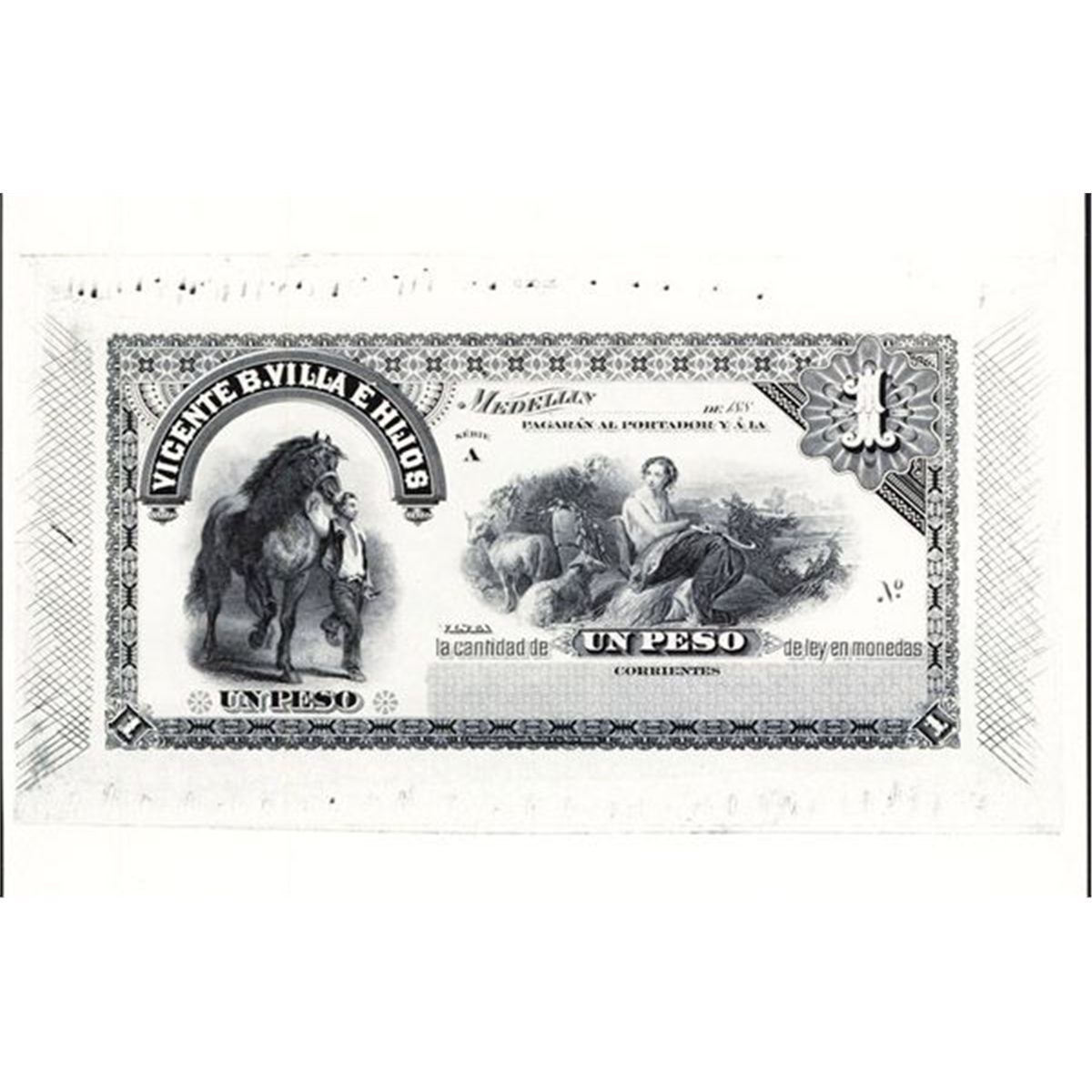 Medellin, Colombia, 188x (Proprietary proof reprinted by ABNC in the 1970's). 1 Peso, P-S921p. Black on large thin card, man leading horse on left, allegorical reaper with sheep on right, cross hatching in margins, Choice uncirculated condition. Rare note in any condition or format. ABNC.