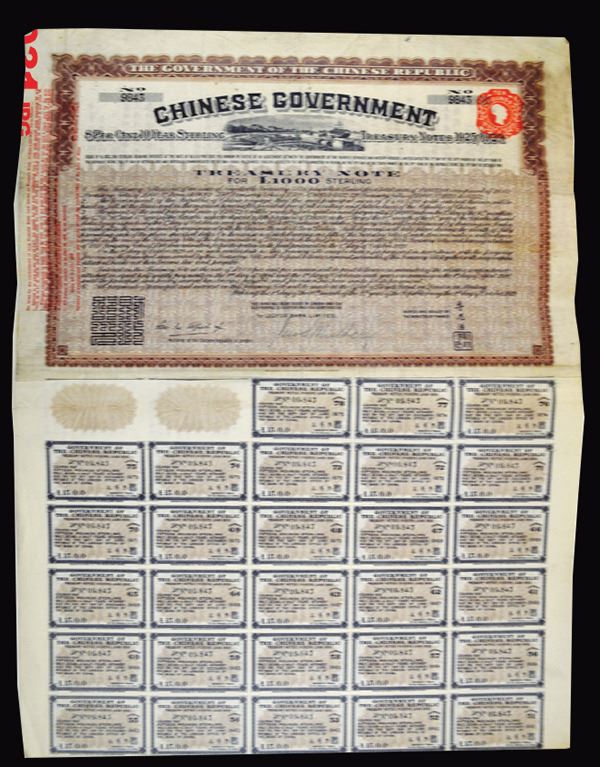 China. 1000 Pounds 8%, 10 Year Sterling Treasury Notes. Brown border and underprint. Most of the coupons are still attached. British tax stamp. Very Fine. Old tape residue attaching coupons. Lloyds Bank LTD.