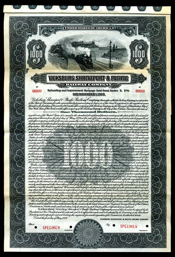 Vicksburg, Shreveport & Pacific Railway Co., 1929 Specimen 5% Gold Coupon Bond. Louisiana, 1929, $1000, Specimen, Refunding and Improvement Mortgage Gold Bond, Series B, XF, ABNC. Unlisted later date in Cox.