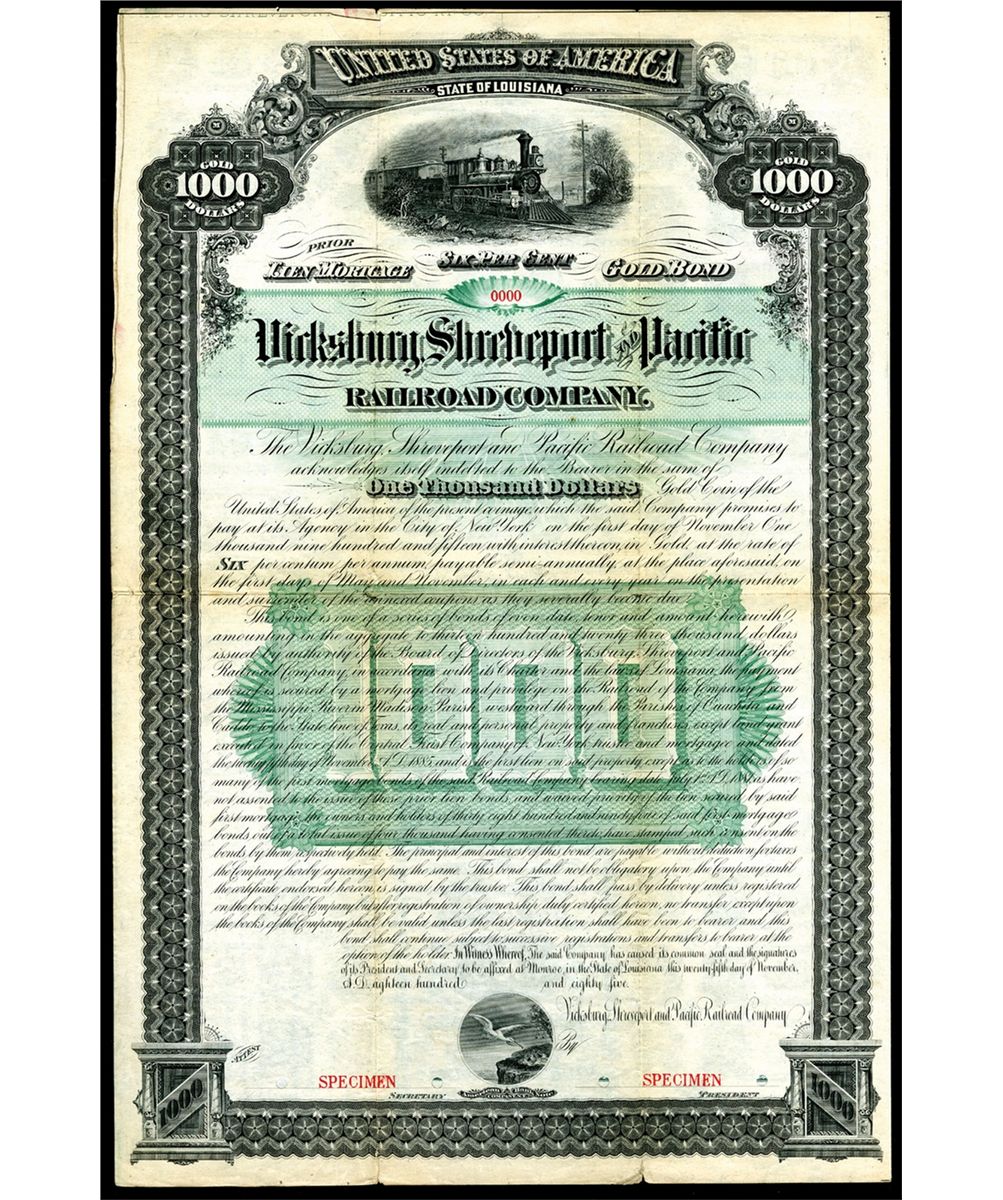 Louisiana, 1885. $1000, Specimen bond. Prior Lien Mortgage 6% Gold Bond. Black border and green undertint. Locomotive L-R passing telegraph lines on top and stork feeding young on bottom. POC's. Coupons attached. VF condition. Rare and attractive bond. Unlisted bond variety and date in Cox. ABNC. Possibly a unique variety.