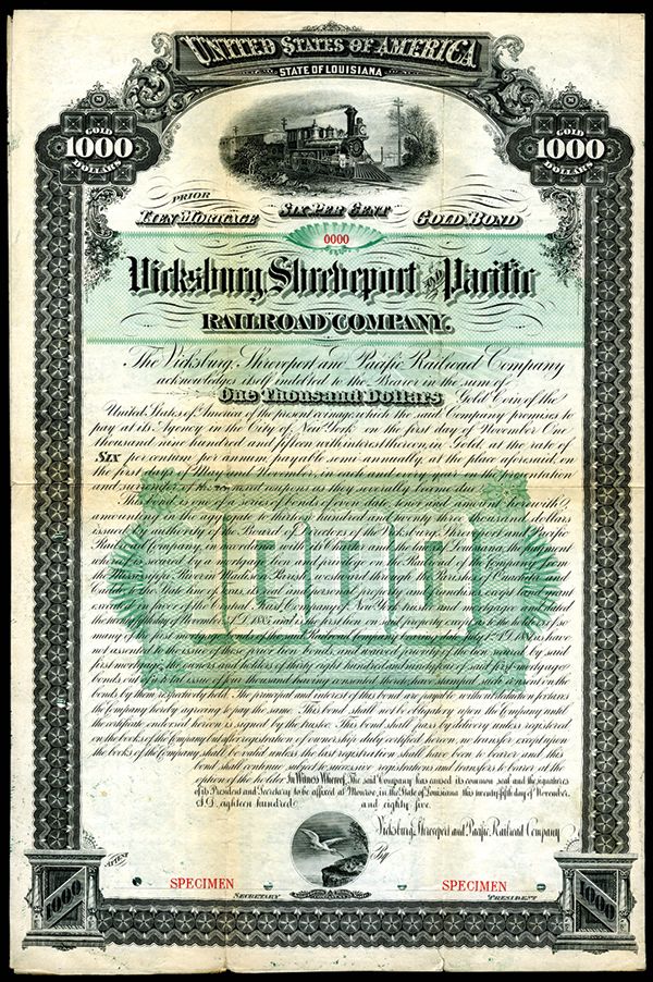 Vicksburg, Shreveport and Pacific Railroad Co., 1885 Specimen Bond. Monroe, Louisiana, 1885. Specimen bond. $1000. Prior Lien Mortgage 6% Gold Coupon Bond. Black border and green undertint. Locomotive L-R passing telegraph lines on top and stork feeding young on bottom. Red specimen overprint, "0000" serial numbers and POC's. Coupons attached. Fine to VF condition with minor edge splits at fold, archival handling and the usual folds from storage. Rare and attractive bond. Cox Plate note. ABNC.