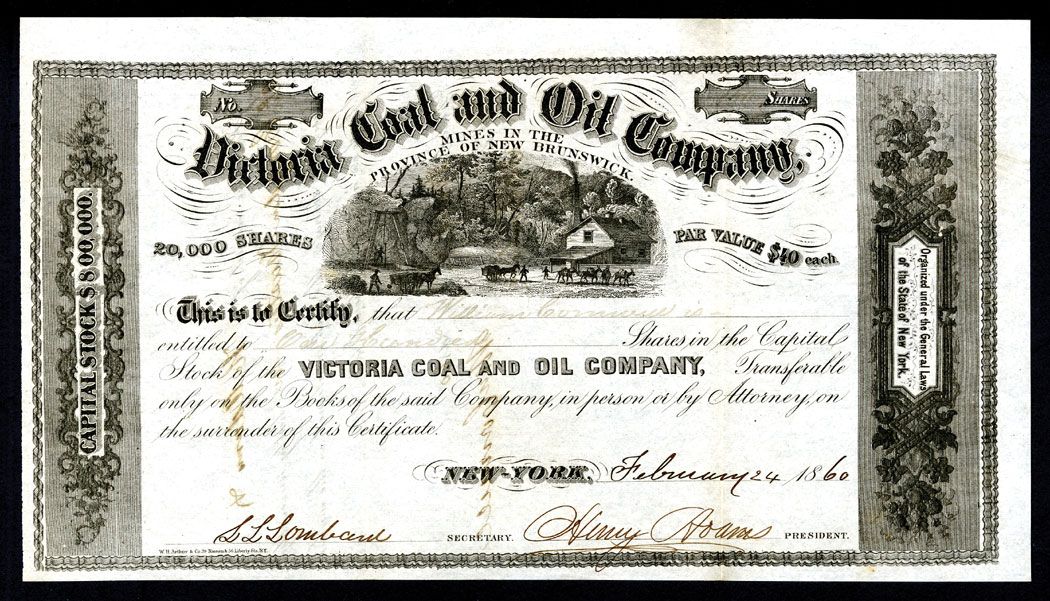 New York and Canada, 100 Shares, Issued and uncancelled, black on off white paper, mules pulling wagons by mine or factory, Mines located in Province of New Brunswick, Canada. Appears VF-XF. Rare and attractive.