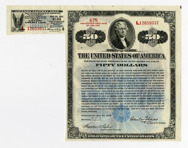 Victory Liberty Loan 4.75 % Gold Bond of 1922-1923 Issue May 20, 1919. The final series of the Liberty Loan Bond Issues of WWI. This $50.00 Convertible Gold Bond Grades XF+, is wonderfully embossed and has the last of the (8) coupons remaining. Black and Red print on Blue- Grey background. SN. L12659337.