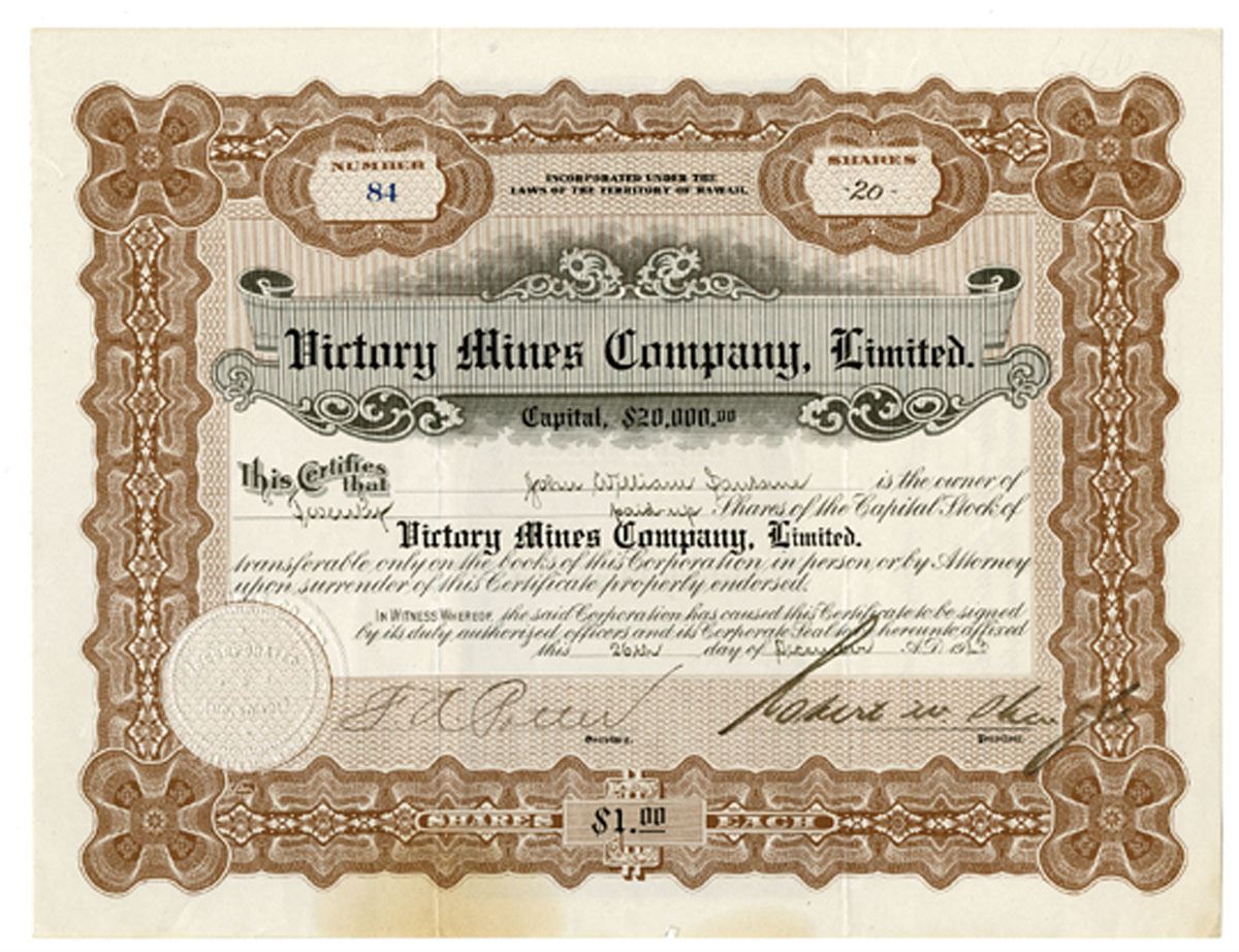 Hawaii, 1913. 20 Shares I/U Capital Stock Certificate, Signed by Robert Witt Shingle, President of the company, S/N 84, Black text with brown border, Embossed company seal at bottom left. Fine-VF condition with some toning at bottom. Shingle was a prominent political figure in Hawaii. Probably a Western U.S. mainland mine.