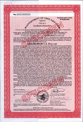 Viet-Nam, Government of Free VietNam Bondsca.1980's. $10,000; $200,000,000 Government of Free Vietnam "Gold reserves Bearer Bond". This is the largest denomination found so far in the archives. It is a $200 Million dollar bond from the Free Government of Vietnam that includes 5 coupons. The bond is offered from a Turks & Caicos Corporation and a Barbados holding facility. Deserves further research. Interesting document. ABNC.