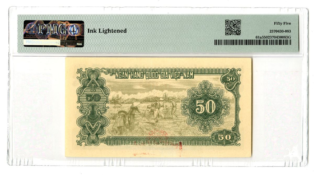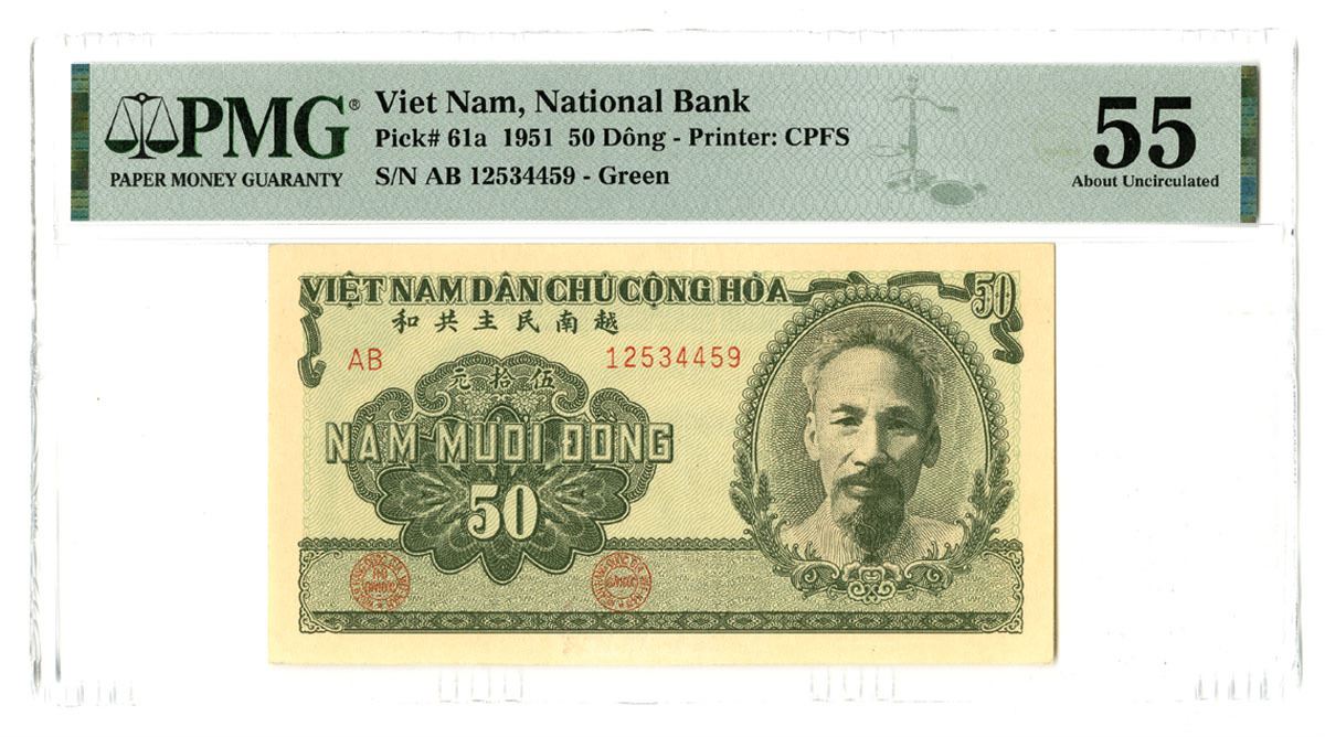 Viet Nam, 1951. 50 Dong, P-61a, Issued Banknote, Shades of green with portrait of HCM at right, Back is green and brown with harvesting scene at center, S/N AB 12534459, PMG graded About Uncirculated 55 with comment "Ink Lightened," CPFS.