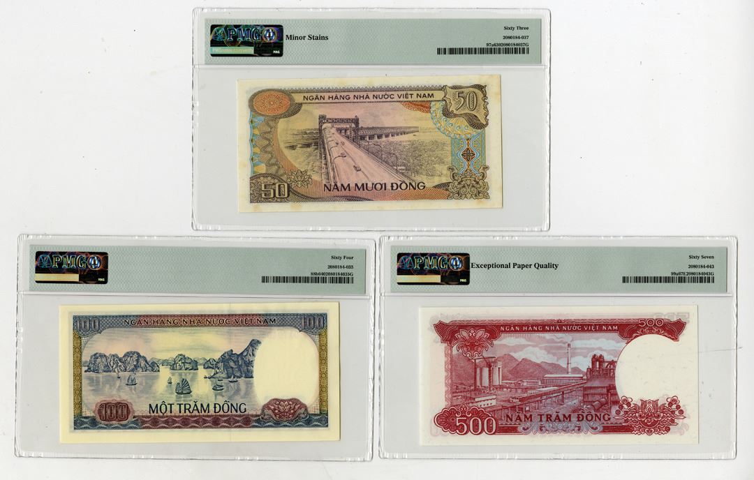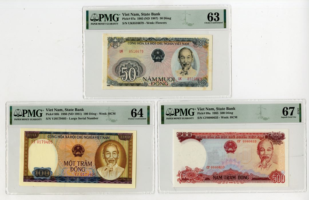 Vietnam. 1980. Lot of 3 notes, includes: 1980, 100 Dong, P-88b, PMG graded CU 64; 1985, 50 Dong, P-97a, PMG graded CU 63; and, 1985, 500 Dong, 99a, PMG graded Superb Gem Unc 67 EPQ. All issued notes (3).