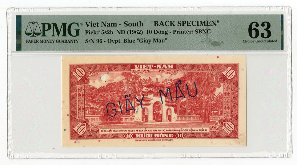 Viet-Nam, ND (1962). 10 Dong, P-5s2b, Back Specimen Banknote, Red print with ornate arch at center, "Giay Mau" overprint in blue at center, S/N 96, PMG graded Choice Uncirculated 63 with comment "Previously Mounted," SBNC.