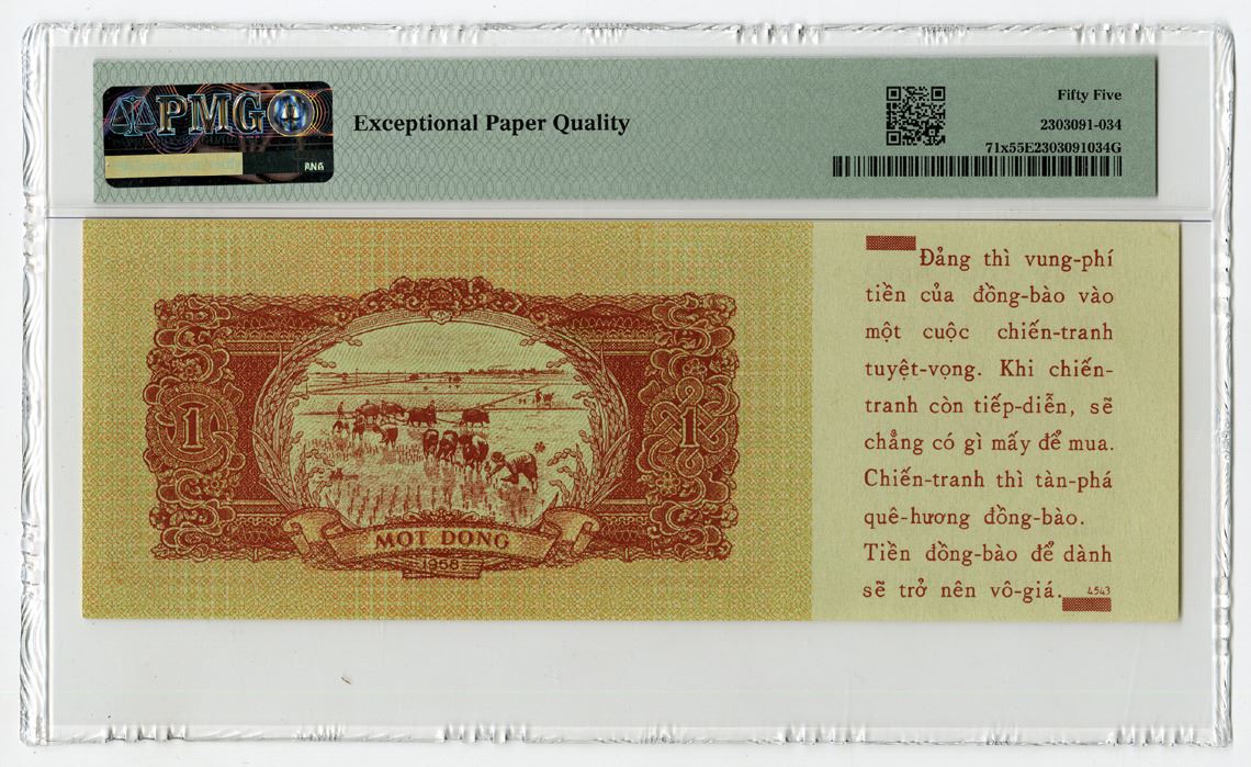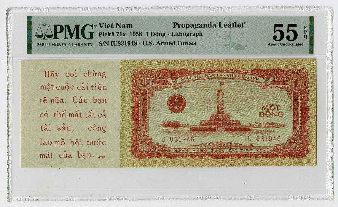 Vietnam, 1958. 1 Dong, P-71x, Propaganda Leaflet, Brown on light green underprint with arms at left and monument with tower and flag at center right, Back is red and brown with workers in rice paddies, US Lithograph counterfeit with propaganda message at left, S/N IU831948, PMG graded About Uncirculated 55 EPQ, CPF-Shanghai.