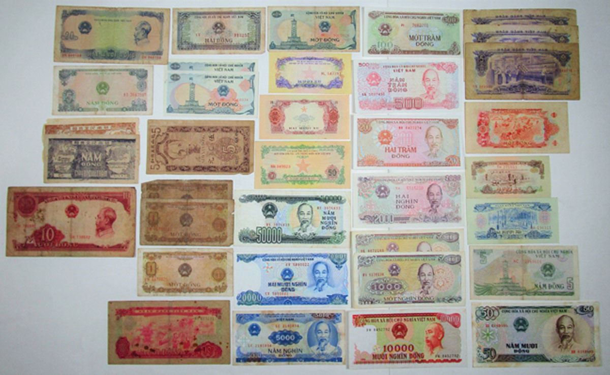 Vietnam & South Vietnam, ca.1946 to 1994. Lot of 34 Vietnamese Banknotes from Various Issuers, Includes: Giay Bac Viet Nam 5 Dong, P-2c, ND (1946); 5 Dong, P-17a (2), ND (1948); National Bank of Viet Nam 10 Dong, P-74a, 1958; Vietnam Bank (South Vietnam) 10 Xu, P-37a, 1966 (1975); 20 Xu, P-38a, 1966 (1975); 1 Dong, P-40a, 1966 (1975); 5 Dong, P-42a (3), 1966 (1975); 10 Dong, P-43a, 1966 (1975); State Bank of Vietnam (Socialist Republic) 1 Dong, P-80a (3), 1976; 5 Dong, P-81b, 1976; 20 Dong, P-83a, 1976; 2 Dong, P-85a, 1980 (1981); 1 Dong, P-90a (3), 1985; 5 Dong, P-92a, 1985; 50 Dong, P-96a, 1985; 200 Dong, P-100c, 1987; 500 Dong, P-101a, 1988 (1989); 100 Dong, P-105b, 1991 (1992); 1000 Dong, P-106a (2), 1988 (1989); 2000 Dong, P-107b, 1988 (1989); 5000 Dong, P-108a, 1991 (1993); 20,000 Dong, P-110a, 1991 (1993); 10,000 Dong, P-115a, 1993; 50,000 Dong, P-116a, 1994; Lot also includes banknotes from the Central Committee of the National Front for the Liberation of South Vietnam 10 Xu, P-R1, ND (1968); 20 Xu, P-R2, ND (1968); and 50 Xu, P-R3, ND (1968). Notes range from VG to CU condition. (34). Sold "AS IS" no returns accepted.