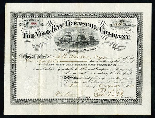 New Jersey, 1886. 100 Shares. I/U, Black printing. Steamship vignette on the high seas. XF condition. Certificate #666. Signed by Charles Pike as president. The Vigo Bay Treasure Company's purpose was to find the treasure in the harbor of Vigo, Spain from the famous battle of 1702 known as the battle of Rande. Rare certificate.
