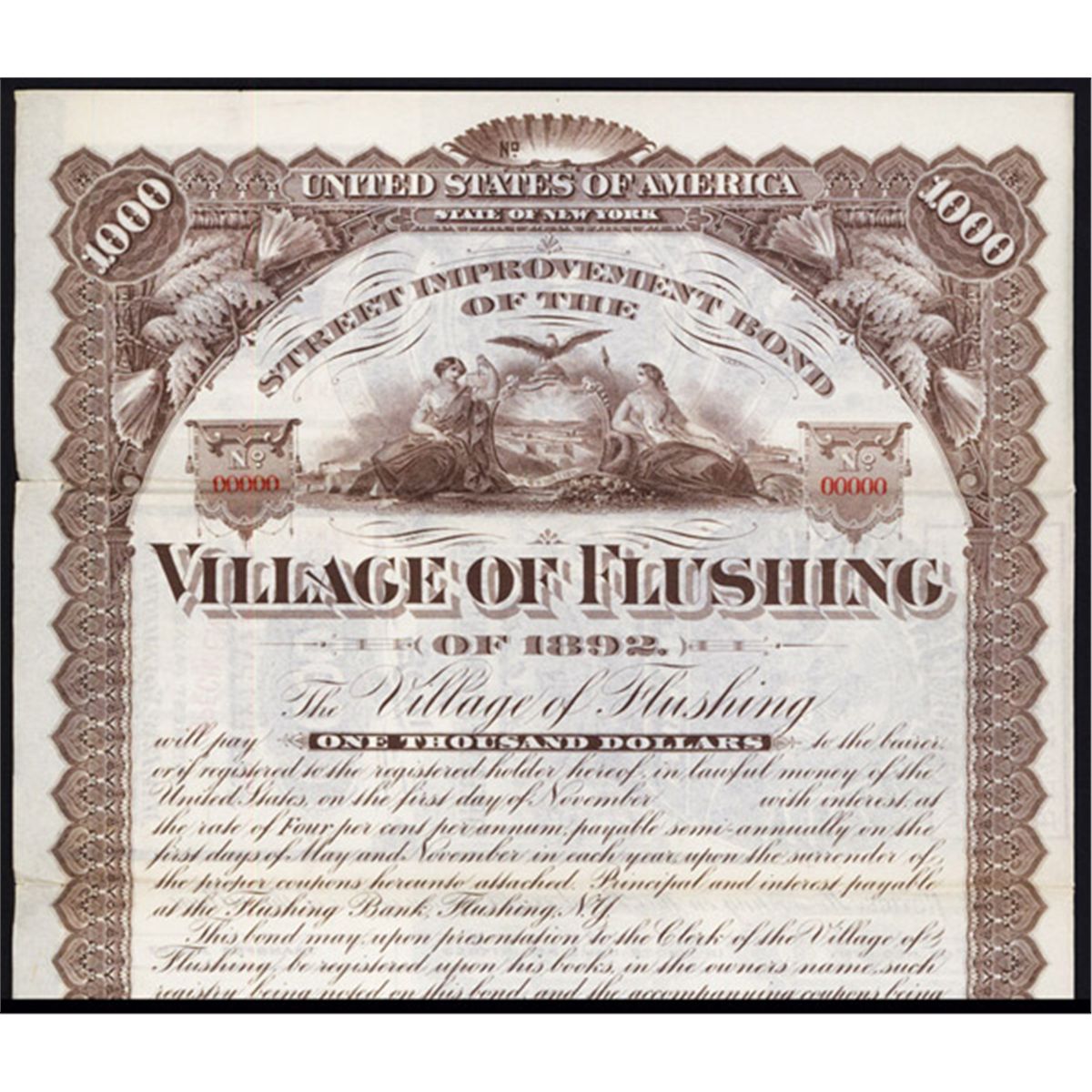 Flushing, New York, 1892, $1000, 4% Specimen bond, VF condition, Brown border and vignette, Allegorical women flank Arms of NY, POC's, ABNC. Established in 1645 by Dutch settlers. The Town of Flushing was dissolved in 1898 when Queens became a part of New York City. Well known area of Queens, NY where the 1964 World's Fair was held and also is the home to the New York Mets Baseball team and the U.S. Open Tennis tournament.
