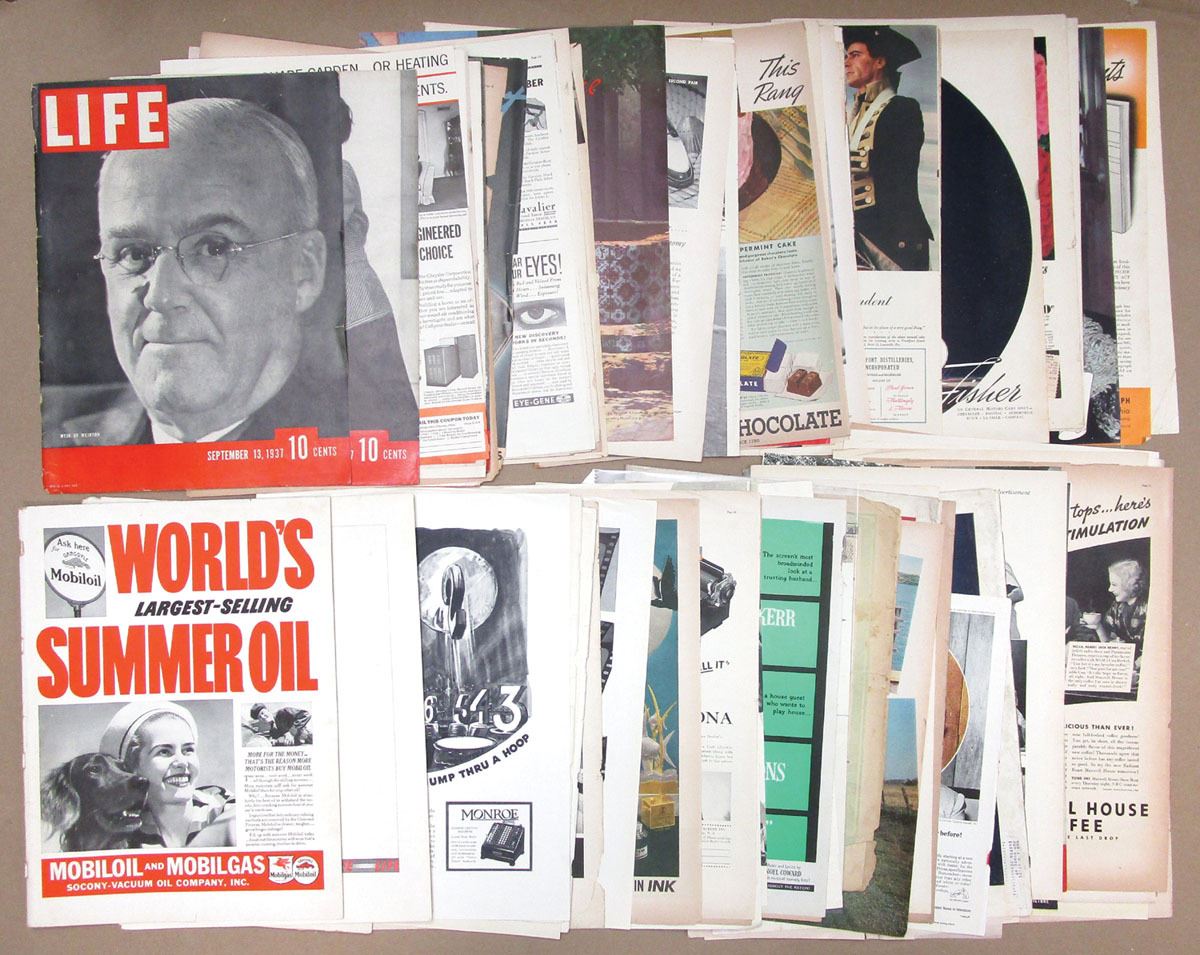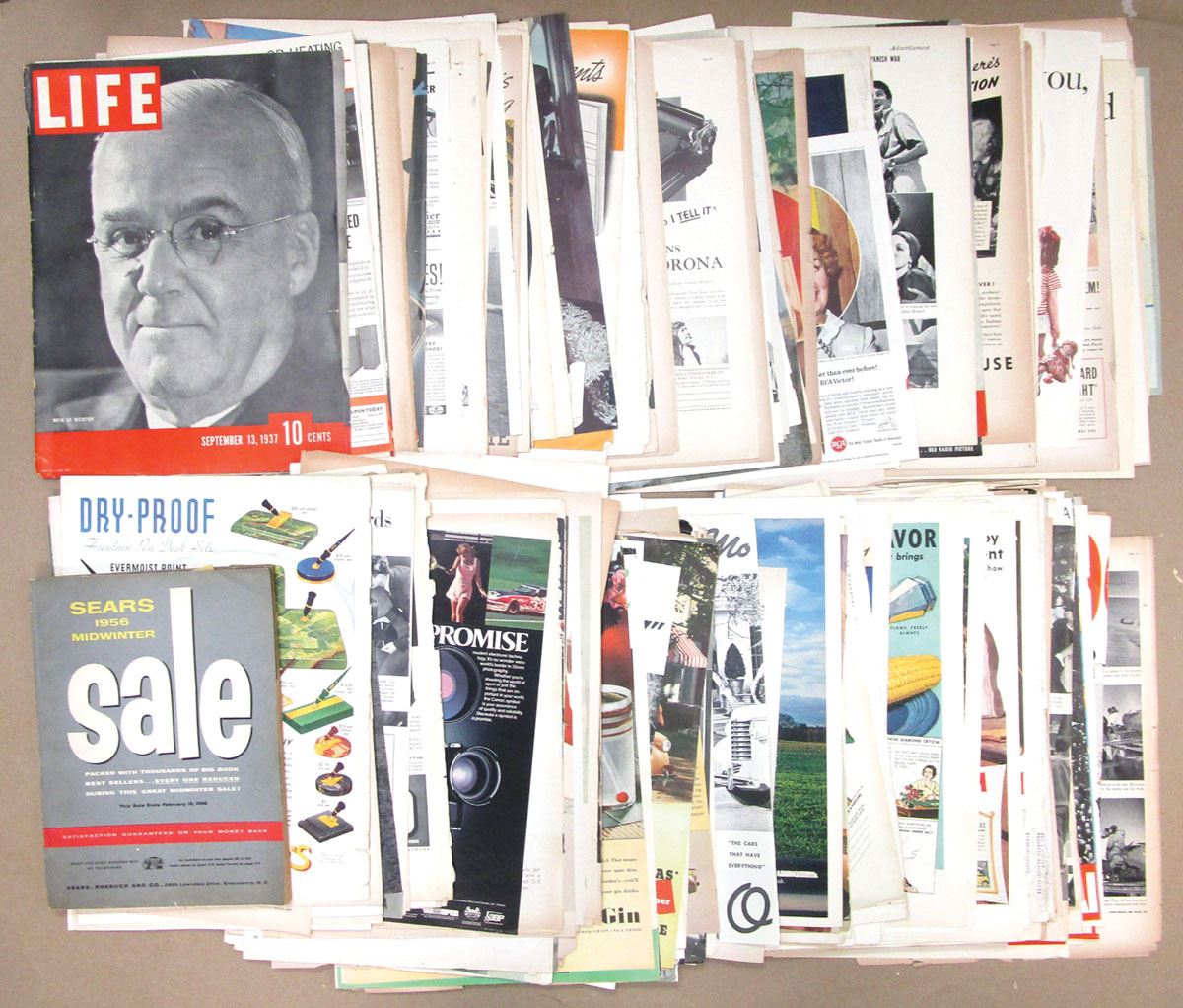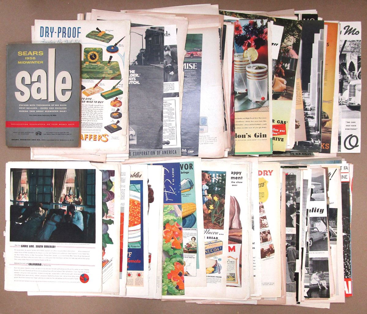 Large mixed collection of original magazines, clipped advertisements, and promotional ephemera, Includes Life Magazine covers and full page advertisements, Lot also includes Sears 1956 Midwinter magazine. Ads are for General Tires, Texaco, Goodrich Tires, Pennsylvania Oil, Del Monte Pineapple Juice, Glenmore Distilleries, RCA Air Conditioning, Mustang, Lionel Trains and so many more. Adds range from Fine to XF condition. Sold "AS IS" no returns accepted.