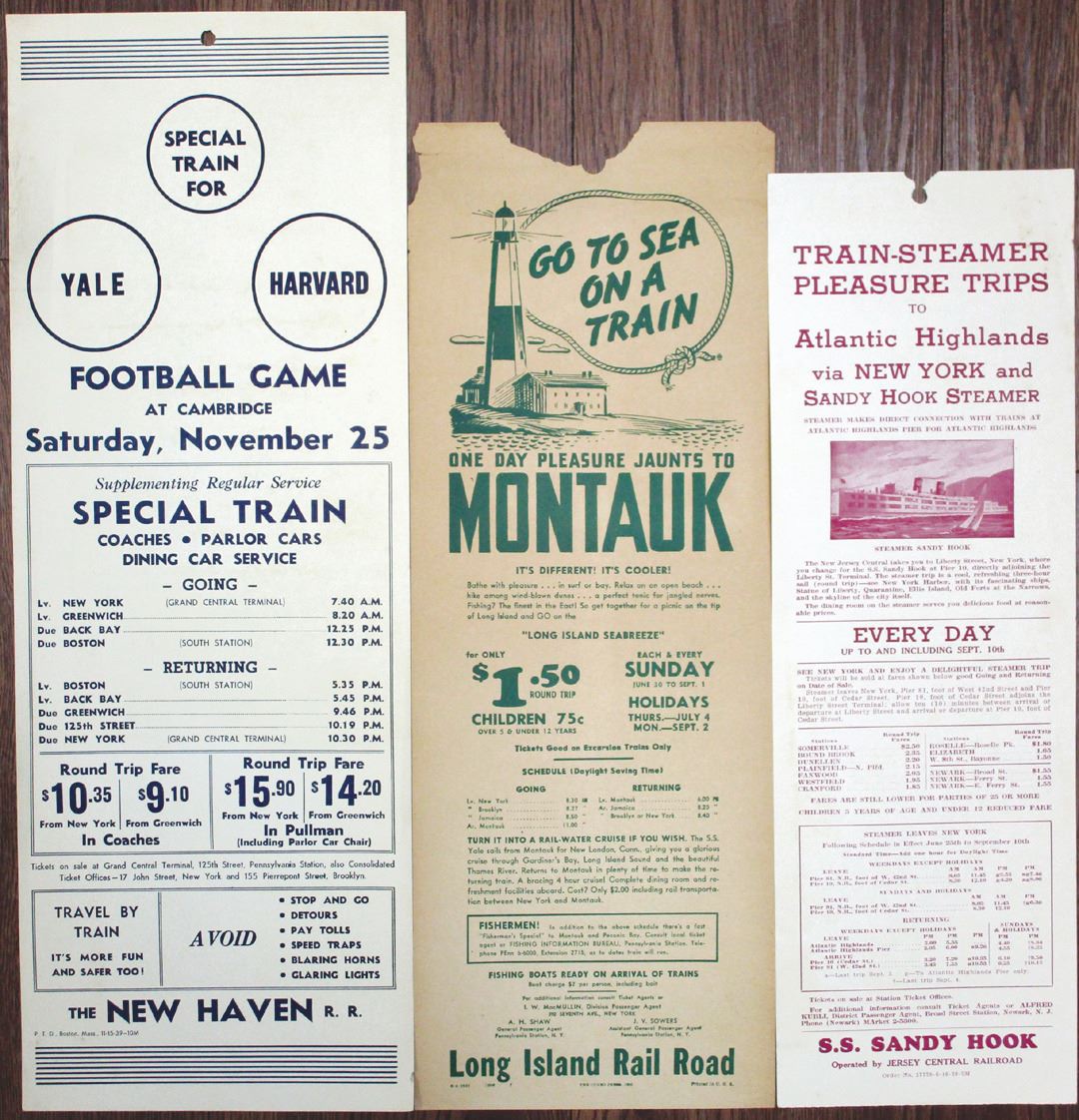 New York, Connecticut and Massachusetts. Lot of 3 steamboat and railroad broadsides. 1939 Flier for Train-Steamer Pleasure Trips to the Atlantic Highlands via New York and Sandy Hook Steamer, 5 x 15.25 inches; 1940 Long Island Rail Road advertisement for trips to Montauk, Long Island, including summer hours, 6 x 16 inches; and a 1939 New Haven Rail Road flier for special train service for the Yale vs. Harvard football game, Saturday, November 25th, 6.5 x 18 inches. All are in Fine condition with some signs of wear. (3)