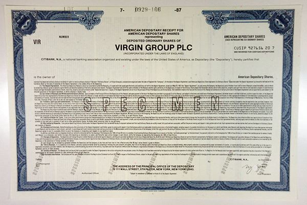 England, 1987. Odd Shares Specimen American Depositary Receipt Stock Certificate, Black text with blue border and black underprint. POCs, VF condition. ABNC. Virgin Group Ltd. is a British multinational venture capital conglomerate founded by entrepreneurs Sir Richard Branson and Nik Powell. Virgin Group's date of incorporation is listed as 1989 by Companies House, who class it as a holding company; however Virgin's business and trading activities date back to the 1970s.