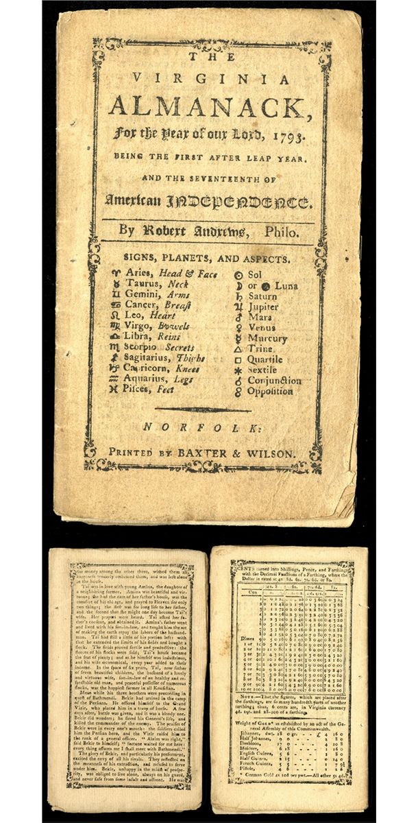 Norfolk, Virginia. Printed by Baxter & Wilson, 3.25 x 5.75 inches, Previously string bound but it is missing, There are 2 different sections, the front section has 24 pages, all of the months plus additional information on the weather, Virginia Senate and Delegate members, Virginia Court Houses and Gold Coin conversion as well as Cents to Shillings, Pence and Farthings conversion, the second section, possibly from the Almanac, includes fictional stories as well as song lyrics including those old favorites like "The Capture of Lord Cornwallis" or "Nothing Like Grog". Mostly VF with minor toning and a few very small foxing spots. Rare and early Virginia Colonial item.