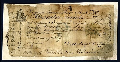 Virginia, September 1, 1775. 12 Pounds, Issued banknote, S/N 144/14094, mounted on thin card that could possibly be removed, Signed by Norvell; Nicholas and Johnson, VG condition with edge tears, small splits and small pieces missing from top left margin, still another rare note in very collectible condition.