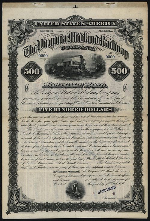 Virginia, 1881, $500, 6% Mortgage Specimen Bond, Moving locomotive with telegraph lines, POC's,Fine condition with toning and splitting, ABNC.