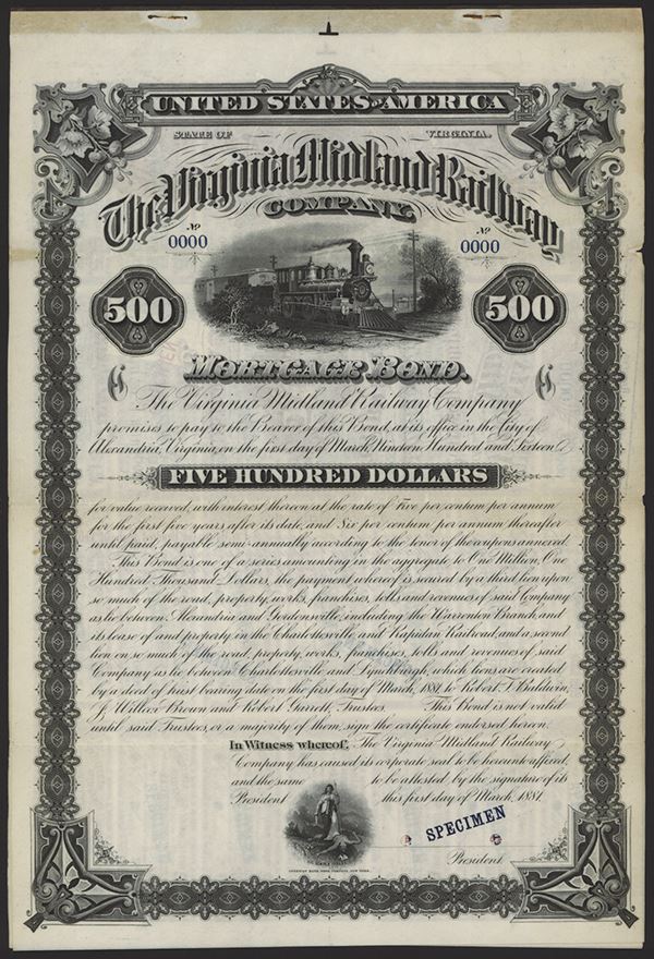 Virginia, 1881, $500, 6% Mortgage Specimen Bond, Moving locomotive with telegraph lines, POC's,Fine condition with toning and splitting, ABNC.