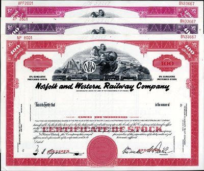 ca.1940-70's. 18 different specimen certificates. 16 have allegorical woman holding globe with train in front of them. VF to XF condition. Scarce group. Many not listed in Cox. SCBNC.