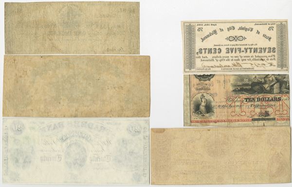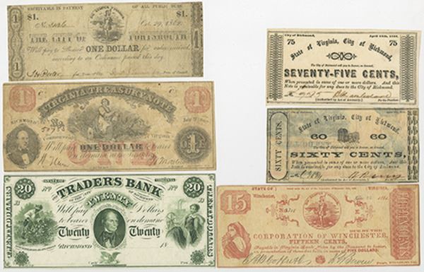 Virginia. Lot of 6 notes, includes Richmond, State of Virginia, 1862, 60 cts, (printed on the back of a $10 note), VF; and 75 cts, AU to Unc.; 1861, Corporation of Winchester, 15 cents, Red, Fine to Choice Fine; 1862, City of Portsmouth, $1, VG-Fine; 1862, Virginia Treasury Note, Fine to Choice Fine; and Richmond, Traders Bank, $20, 1850-60's Obsolete reprint note, green, Unc. attractive banknote assortment. (6).