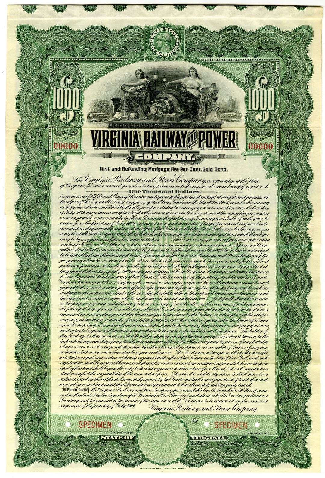 Virginia, 1909. $1000 Specimen 5% First and Refunding Mortgage Gold Coupon Bond, Black text with green border and undertint, Pair of allegorical women at top center. Red specimen overprints, 00000 serial numbers, and POCs. VF condition, ABNC. Unlisted in bond in Cox, Very Rare specimen.